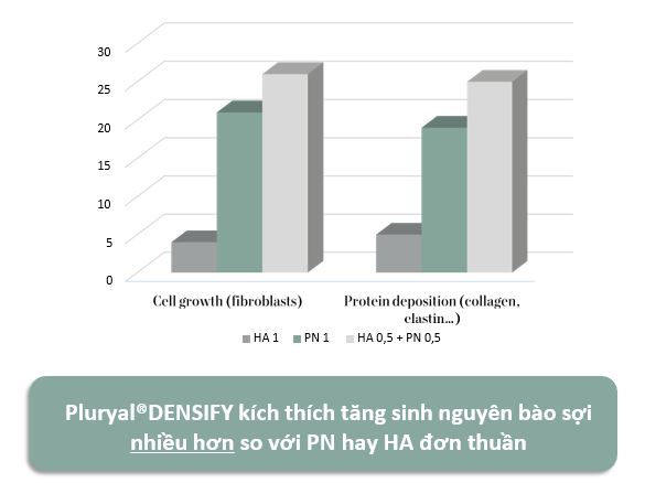 Kết quả cho thấy, công thức độc quyền PN+HA trong Pluryal Densify mang lại hiệu quả cao nhất. Sự kết hợp này kích thích tăng sinh nguyên bào sợi (fibroblasts) và lắng đọng protein (như collagen và elastin) hiệu quả hơn hẳn so với khi sử dụng PN hay HA đơn thuần.