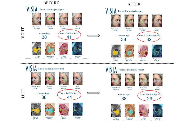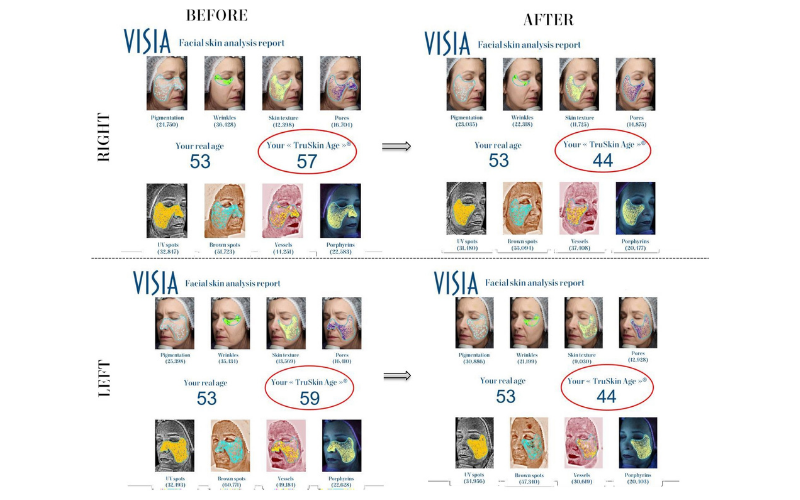 Kết quả cho thấy: việc sử dụng sản phẩm có công thức kết hợp PN+HA giúp da trẻ hóa trung bình 7 năm, có ca tới 15 năm.