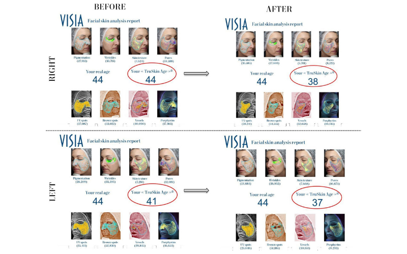 Khách hàng tuổi thật 44 tuổi, tuổi da được đánh giá là 41- 44 tuổi. Sau hai liệu trình, tuổi da của khách hàng đã giảm xuống còn 37- 38 tuổi.