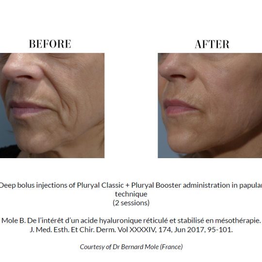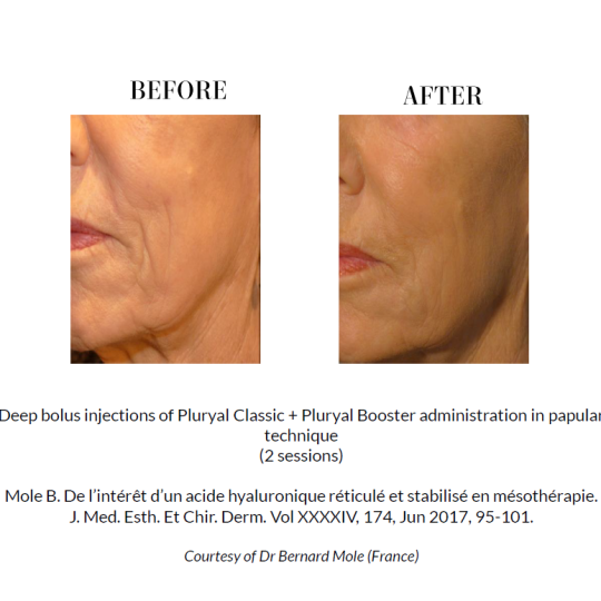 ** Mole B. De l’intérêt d’un acide hyaluronique réticulé et stabilize en mésothérapie. J. Med. Esth. Et Chir. Derma. Vol XXXXIV, 174, juin 2017, 95-1010.